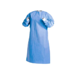 Bata quirúrgica (nivel por debajo de las rodillas) descartable, con cuello redondeado, con amarre posterior con 02 lazos en el cuello y 02 lazos parte delantera, con uniones termoselladas, de manga larga con puños Ribb de algodón en las muñecas para una mayor sujeción y protección, no tiene bolsillos, no traslúcido (opacidad) y fresco.